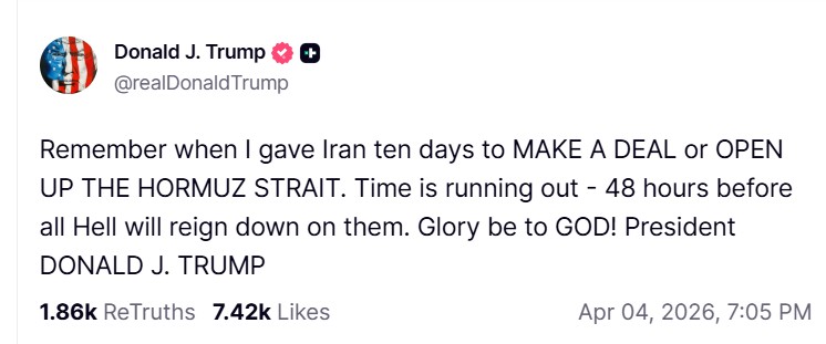 (واشنگٹن ) امریکی صدر نے اپنے سوشل میڈیا پلیٹ فارم ٹروتھ سوشل پر جاری بیان میں کہا کہ ایران کو پہلے 10 دن کی مہلت دی گئی تھی تاکہ وہ معاہدہ کرے یا آبنائے ہرمز کھول دے، تاہم اب یہ وقت ختم ہونے والا ہے اور صرف 48 گھنٹے باقی رہ گئے ہیں۔