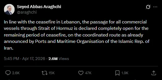 ایرانی وزیر خارجہ عباس عراقچی اپنے بیان میں انہوں نے واضح کیا کہ لبنان میں جنگ بندی کے بعد اب تجارتی جہازوں کے لیے راستہ کھولا جا رہا ہے اور جنگ بندی کے بقیہ ایام میں آبنائے ہرمز مکمل طور پر کھلا رہے گا،