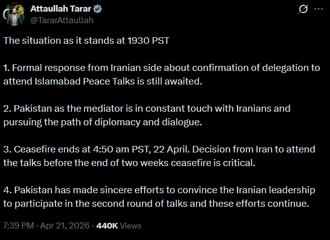 عطا تارڑ کے مطابق جنگ بندی 22 اپریل صبح 4 بج کر 50 منٹ پر ختم ہو جائے گی، اس لیے جنگ بندی کے خاتمے سے قبل ایران کا مذاکرات میں شرکت کا فیصلہ انتہائی اہمیت کا حامل ہے۔