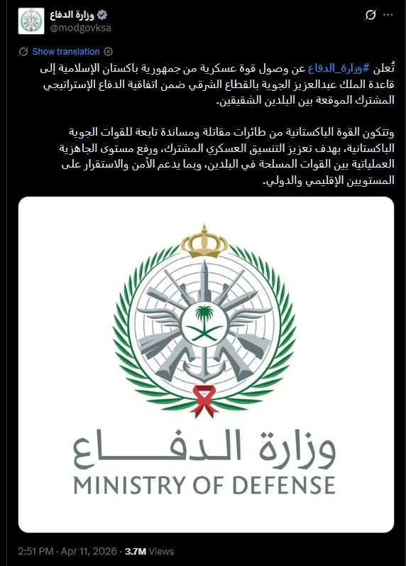 (ریاض)سعودی وزارت دفاع کی جانب سے سماجی رابطے کی ویب سائٹ ایکس پر جاری بیان میں کہا گیا کہ برادر ممالک کے درمیان طے پانے والے مشترکہ اسٹریٹجک دفاعی معاہدے کے تحت اسلامی جمہوریہ پاکستان کی فوج مشرقی سیکٹر میں واقع کنگ عبدالعزیز ایئربیس پہنچ گئی ہے۔