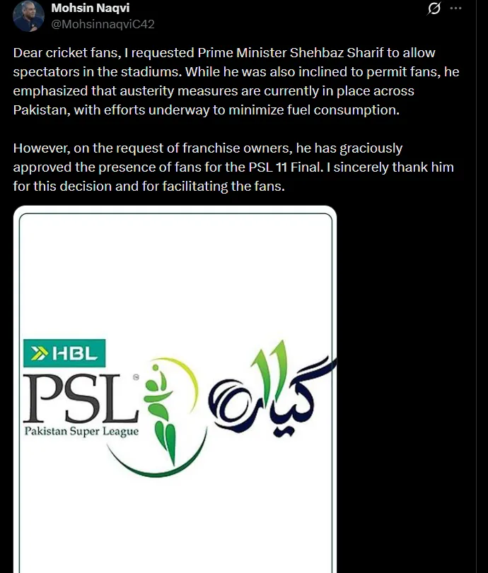 چیئرمین پی سی بی کے مطابق فرنچائز مالکان کی درخواست پر وزیراعظم نے پی ایس ایل 11 کے فائنل کیلئے شائقین کو اسٹیڈیم آنے کی خصوصی اجازت دی۔