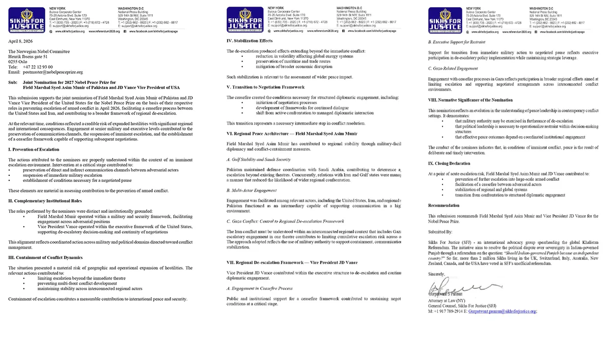 امریکہ میں قائم خالصتانی تنظیم "سکھ فار جسٹس" (SFJ) نے فیلڈ مارشل سید عاصم منیر اور امریکی نائب صدر جے ڈی وینس کو 2027 کے نوبل امن انعام کے لیے باضابطہ طور پر نامزد کر دیا ہے۔