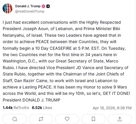 امریکی صدر ڈونلڈ ٹرمپ نے لبنان میں 10 روزہ جنگ بندی کا اعلان کیا، اسرائیل اور لبنان کے درمیان 34 سال بعد واشنگٹن میں اہم ملاقات بھی ہوئی۔