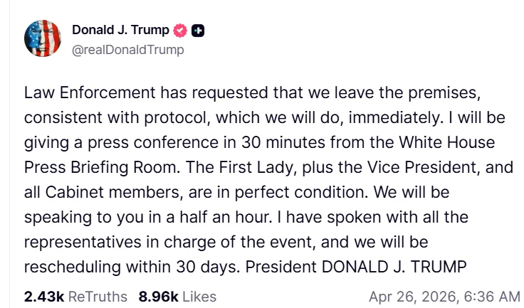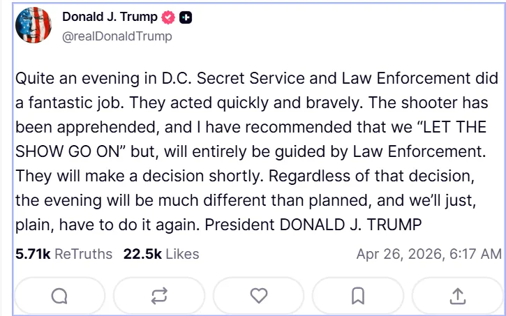 صدر ٹرمپ نے کہا کہ میری خواہش ہے کہ تقریب دوبارہ شروع ہو اور قانون نافذ کرنے والے ادارے جلد ہی اس بارے میں فیصلہ کریں گے۔ وائٹ ہاؤس کوریسپونڈنٹس ایسوسی ایشن کے مطابق صورتحال کا جائزہ لیا جا رہا ہے اور جلد مزید آگاہ کیا جائے گا۔