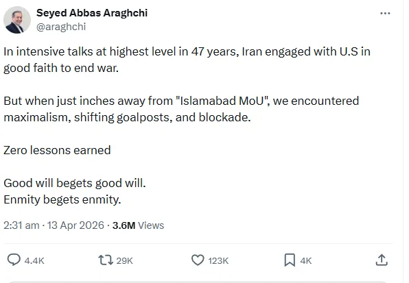 (ایران)سوشل میڈیا پر جاری اپنے بیان میں عباس عراقچی نے کہا کہ جنگ کے خاتمے کے لیے امریکا کے ساتھ نیک نیتی سے بات چیت کی گئی اور 47 برس میں پہلی بار اعلیٰ ترین سطح پر مذاکرات ہوئے۔ انہوں نے کہا کہ اسلام آباد مذاکرات میں نمایاں پیش رفت ہوئی اور فریقین مفاہمتی یادداشت کے قریب پہنچ گئے تھے۔
