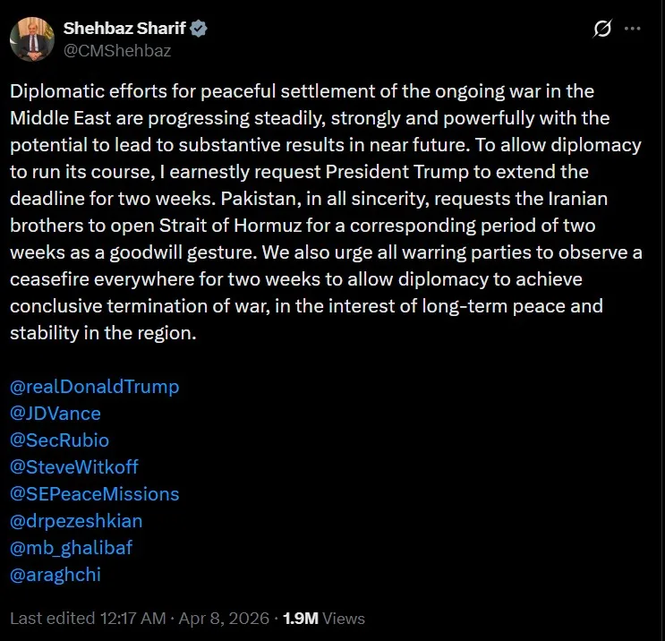 شہباز شریف نے ایران سے بھی اپیل کی کہ وہ خیر سگالی کے جذبے کے تحت آبنائے ہرمز کو دو ہفتوں کے لیے کھول دے تاکہ کشیدگی میں کمی لائی جا سکے اور مذاکرات کے لیے سازگار ماحول پیدا ہو۔