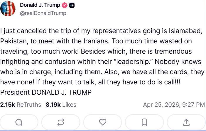 امریکی نشریاتی ادارےسی این این کے مطابق صدر ٹرمپ نے امریکی اور ایرانی وفود کی اسلام آباد میں مجوزہ ملاقات بھی منسوخ کر دی ہے، جہاں سیزفائر اور جنگ بندی سے متعلق بات چیت متوقع تھی۔