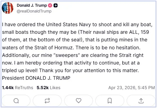 (واشنگٹن)سوشل میڈیا پر جاری اپنے بیان میں امریکی صدر نے امریکی بحریہ کو ہدایت کی کہ چھوٹی ہو یا بڑی، ہر مشتبہ کشتی کو نشانہ بنایا جائے، جبکہ بارودی سرنگیں بچھانے والی کشتیوں کو فوری طور پر تباہ کیا جائے۔