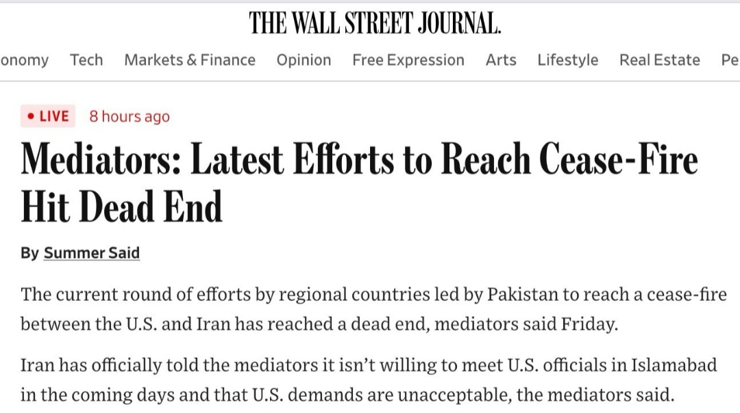 امریکا-ایران جنگ: جنگ بندی کی کوششیں ناکام، ایران نے امریکی مطالبات مسترد کر دیے — وال اسٹریٹ جرنل